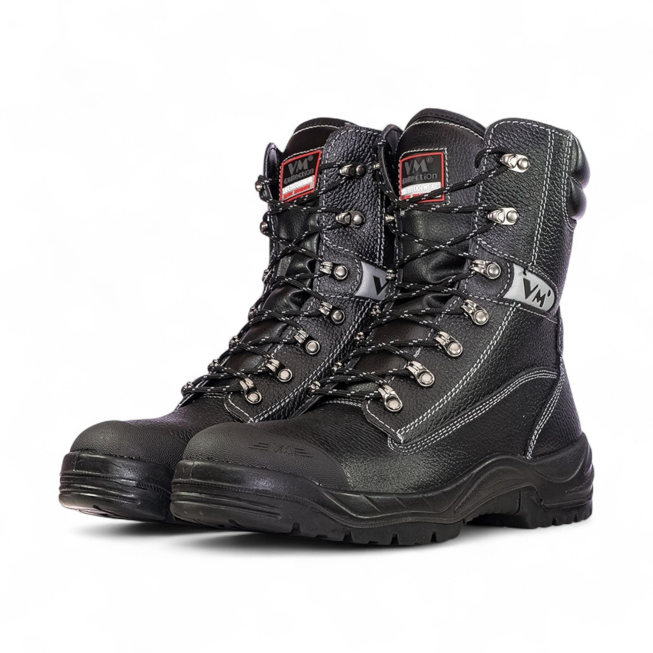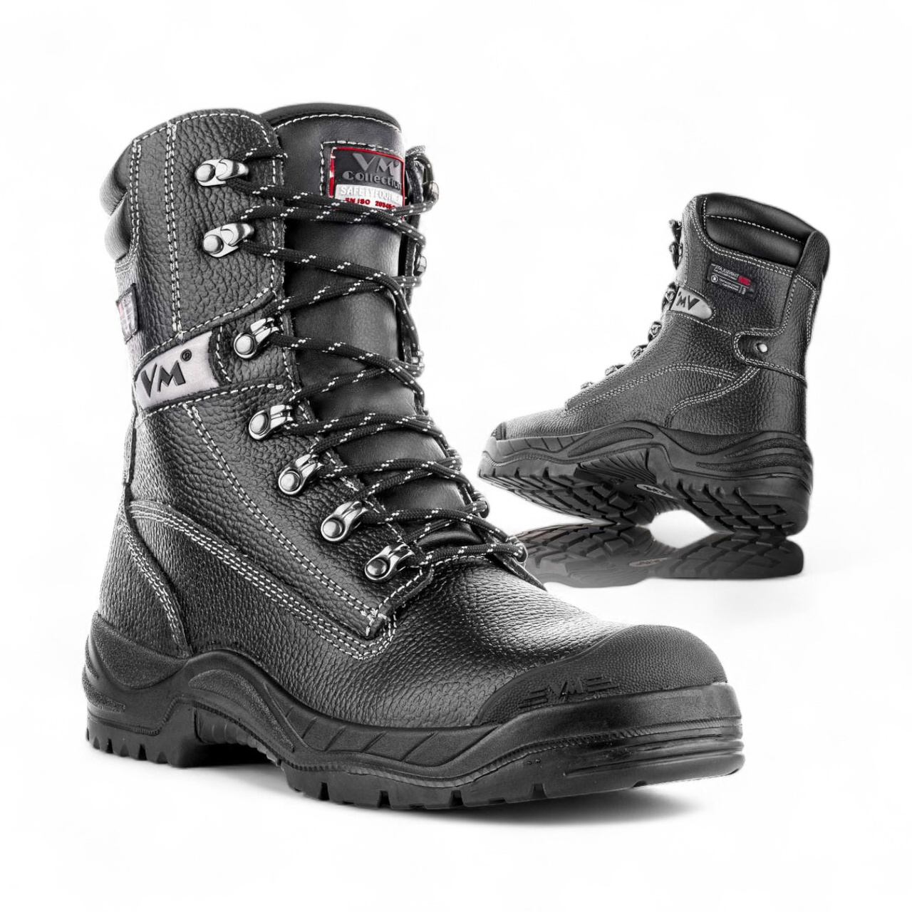 VM LONDON 2330-S3 CI are protective boots made entirely of high-quality natural leather, designed for use in demanding industrial environments. They comply with the EN ISO 20345:2011 standard and offer complete protection against mechanical, thermal and chemical risks, being equipped with a metal toe cap, anti-perforation midsole and thermal insulation materials.