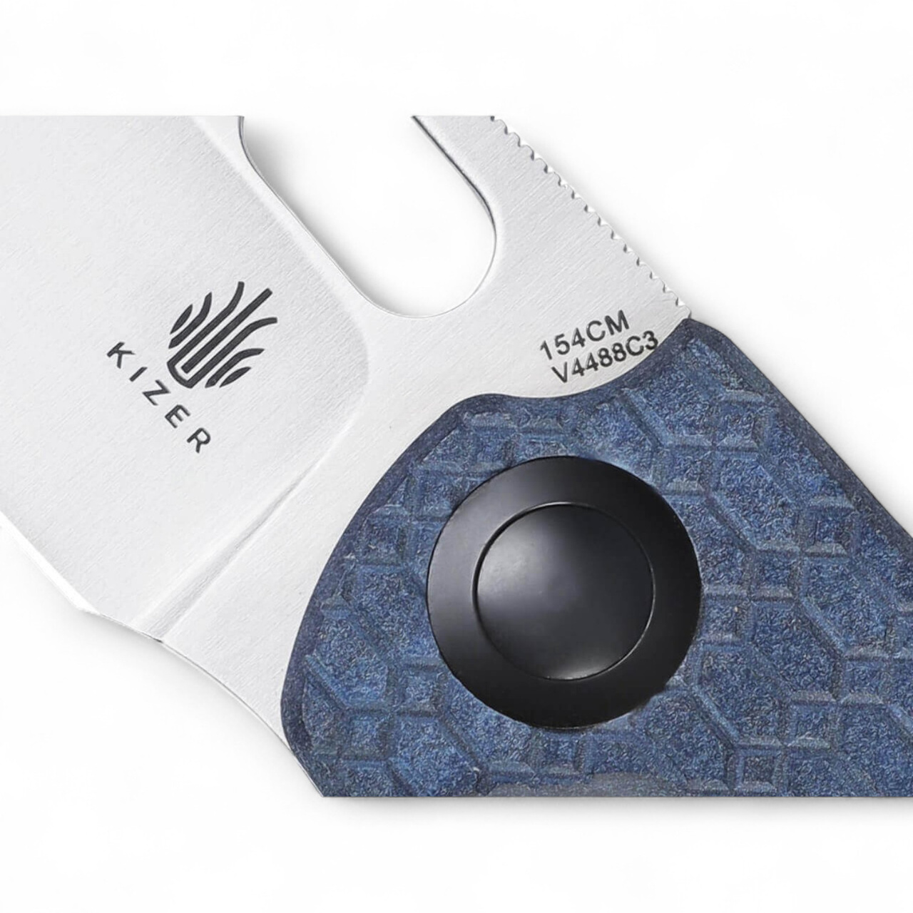 The Kizer Sheepdog C01C, created by Chris Conaway of Sheepdog Knives, is equipped with a large sheepfoot blade made of 154CM steel, characterized by excellent cutting ability. Thanks to the ball bearings, the knife opens smoothly and easily through the thumb hole, and the clutch lock system ensures a secure hold during use. The textured blue Richlite handle provides a secure grip. It features a tip-up clip (right) for comfortable carrying.