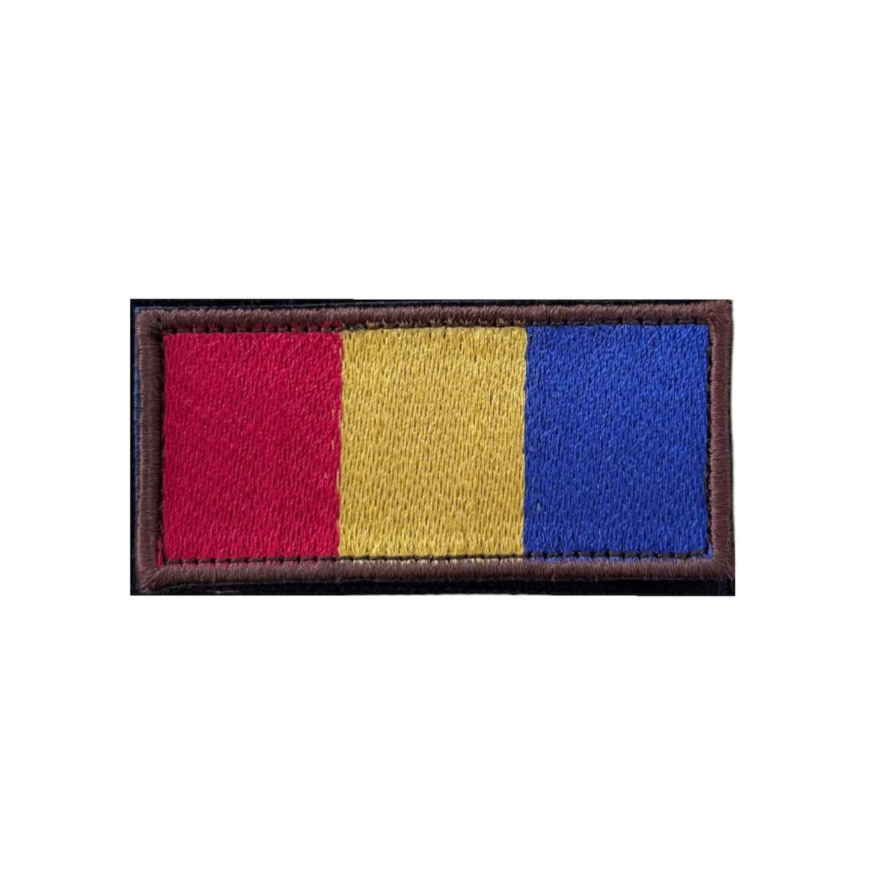 Emblemă brodată cu tricolorul României, cu aplicare Velcro (cu scai) și contur maro discret. Realizată pe suport textil, cu brodare simplificată și culori ușor estompate, oferind o integrare discretă pe echipamente de teren.