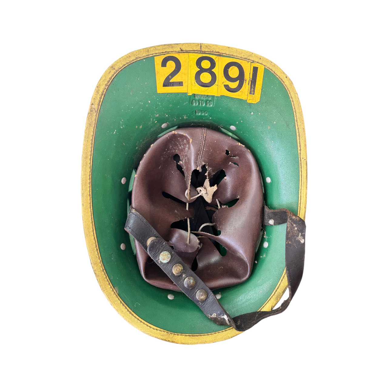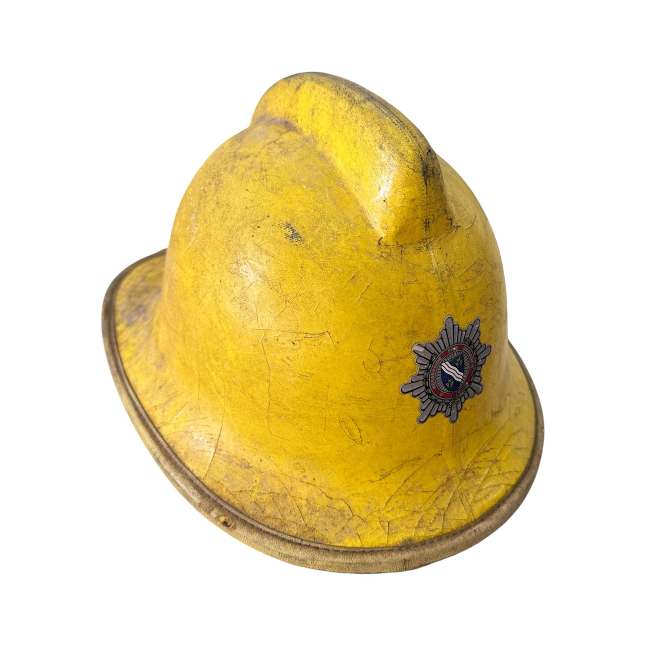 This yellow Cromwell County Pattern helmet was introduced in 1974 to replace the black cork helmets, offering better visibility and a modern design for that period. It is a collector's item appreciated by enthusiasts of firefighting equipment and the history of the London Fire Brigade.