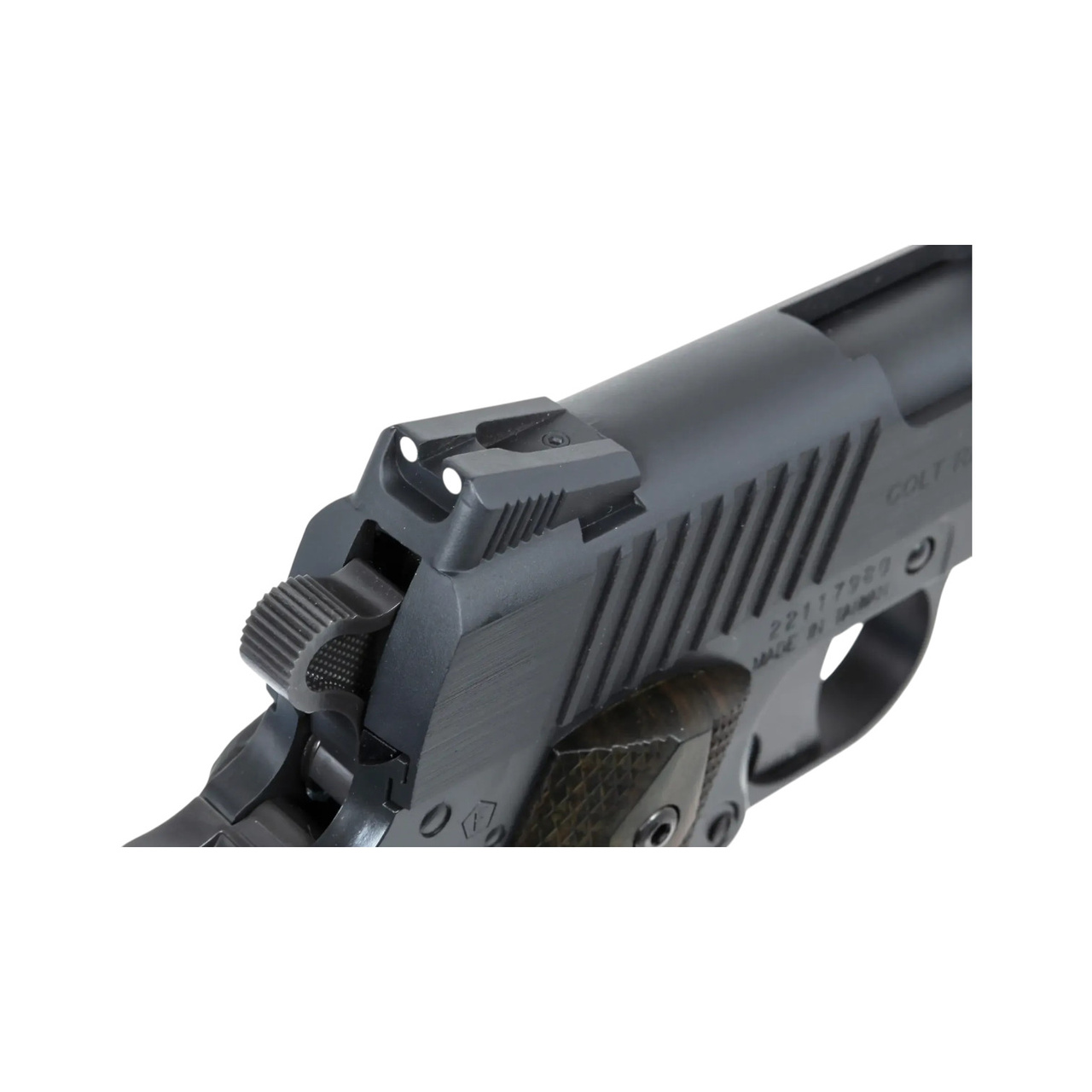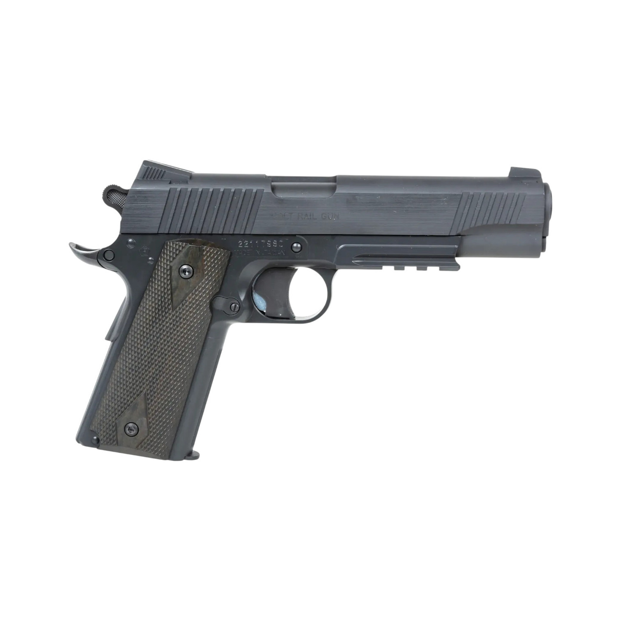 Airsoft pistol from Cybergun, non-blow-back version. The pistol has a metal slide marked with the Colt Government Model and caliber inscriptions. The slide has side striations for easier handling, and under the barrel there is a RIS rail for mounting additional accessories such as a flashlight or laser.