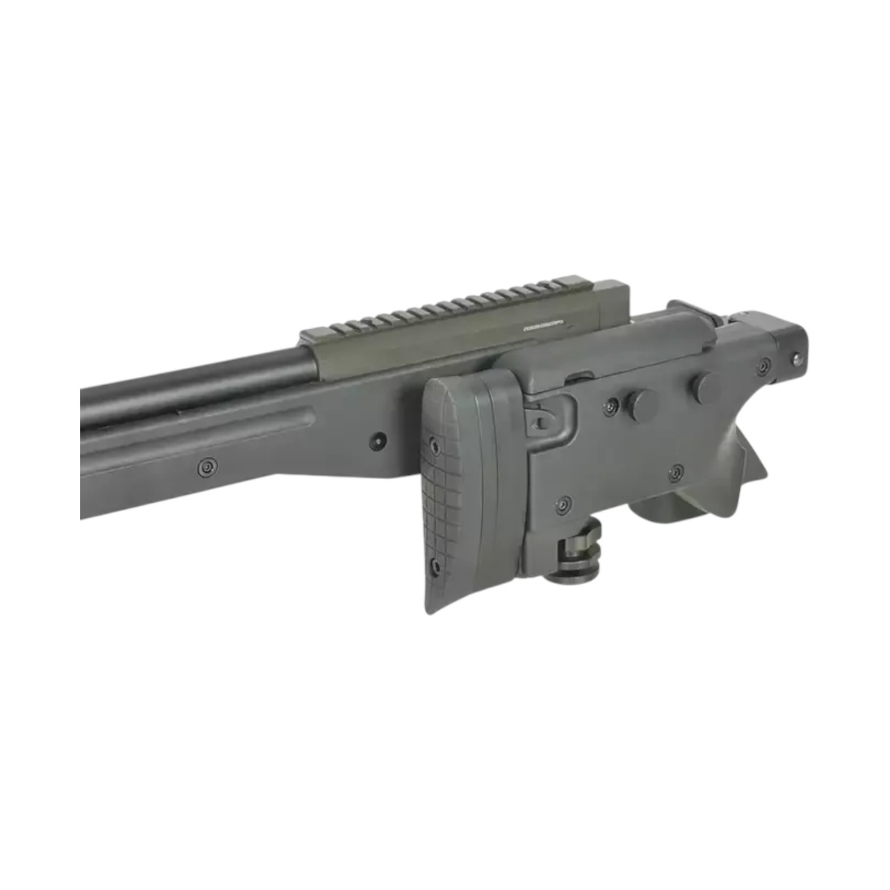 The stock is made of reinforced polymer, similar to the material used in the real weapon, and is equipped with sling and bipod attachment points. Weighing approximately 3.8 kg, the replica is well balanced and comfortable for extended use thanks to the AWM thumbhole grip. The adjustable and folding stock allows for ergonomic adjustments (length and height of the monopod) and facilitates transport in cases.