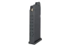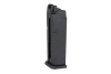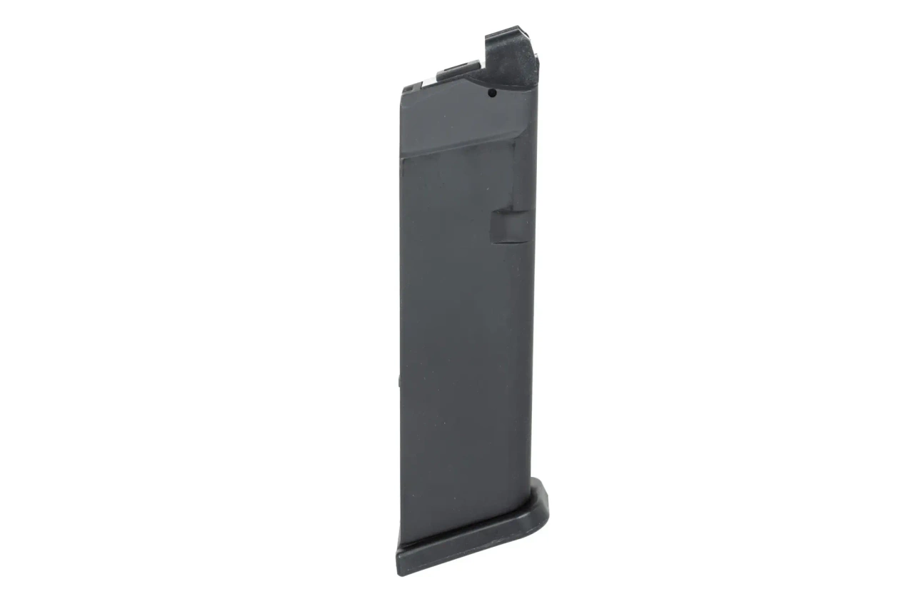 Green gas-powered magazine, made mostly of metal, compatible with Glock 17/18/34 replicas. The magazine has a capacity of 24 BBs and is compatible with replicas manufactured by E&C, TM, and similar models.