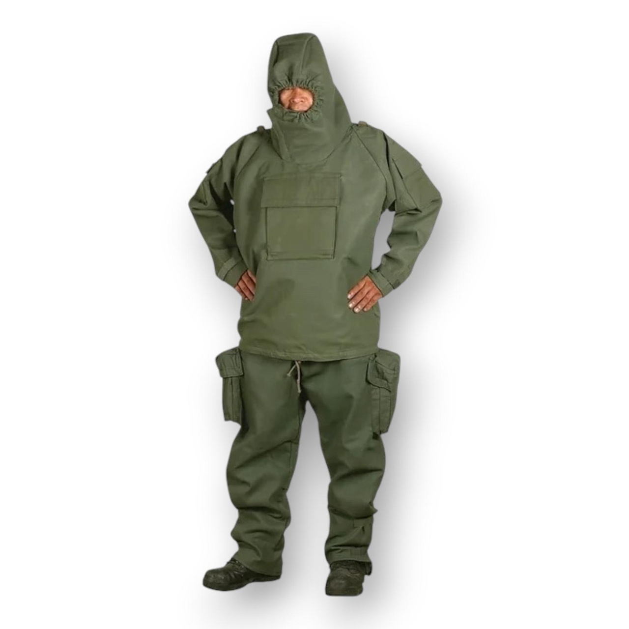 This NBC protective suit comes from the British Army surplus and is OD green. The item is used, which means it no longer guarantees full protection against chemical, biological, or radiological hazards, and is marked with (EXP. RESTRICTIONS).