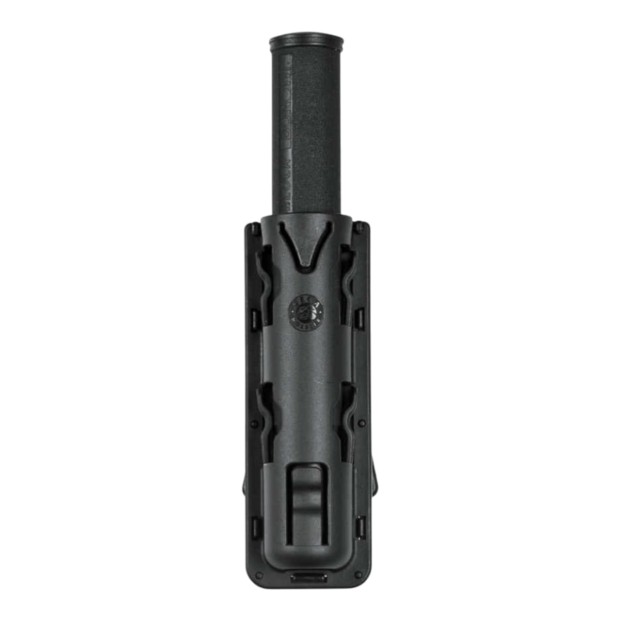 Polymer baton holder equipped with a belt‑mount retaining clip.
