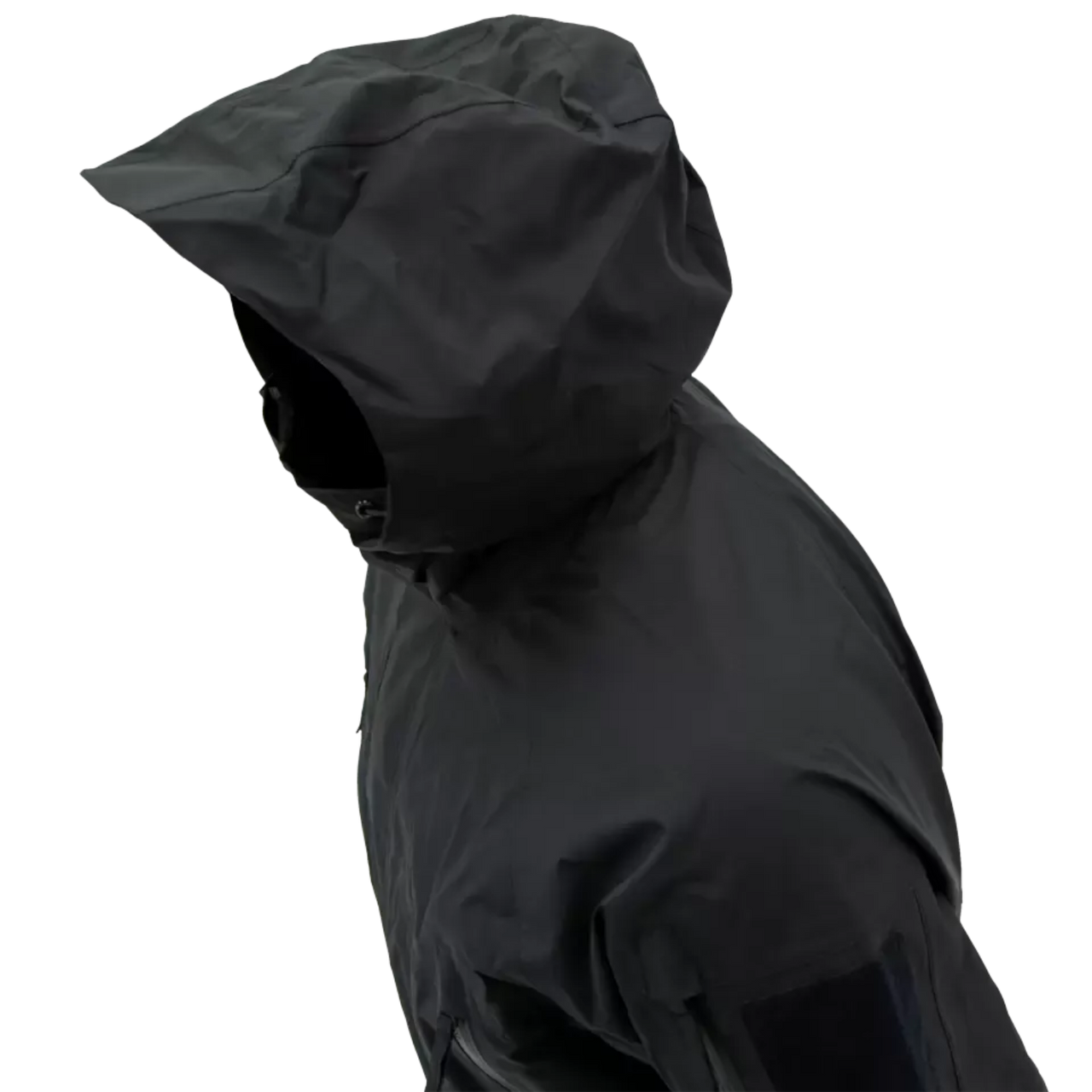 Helmet-compatible hood with two-point adjustment and reinforced brim.