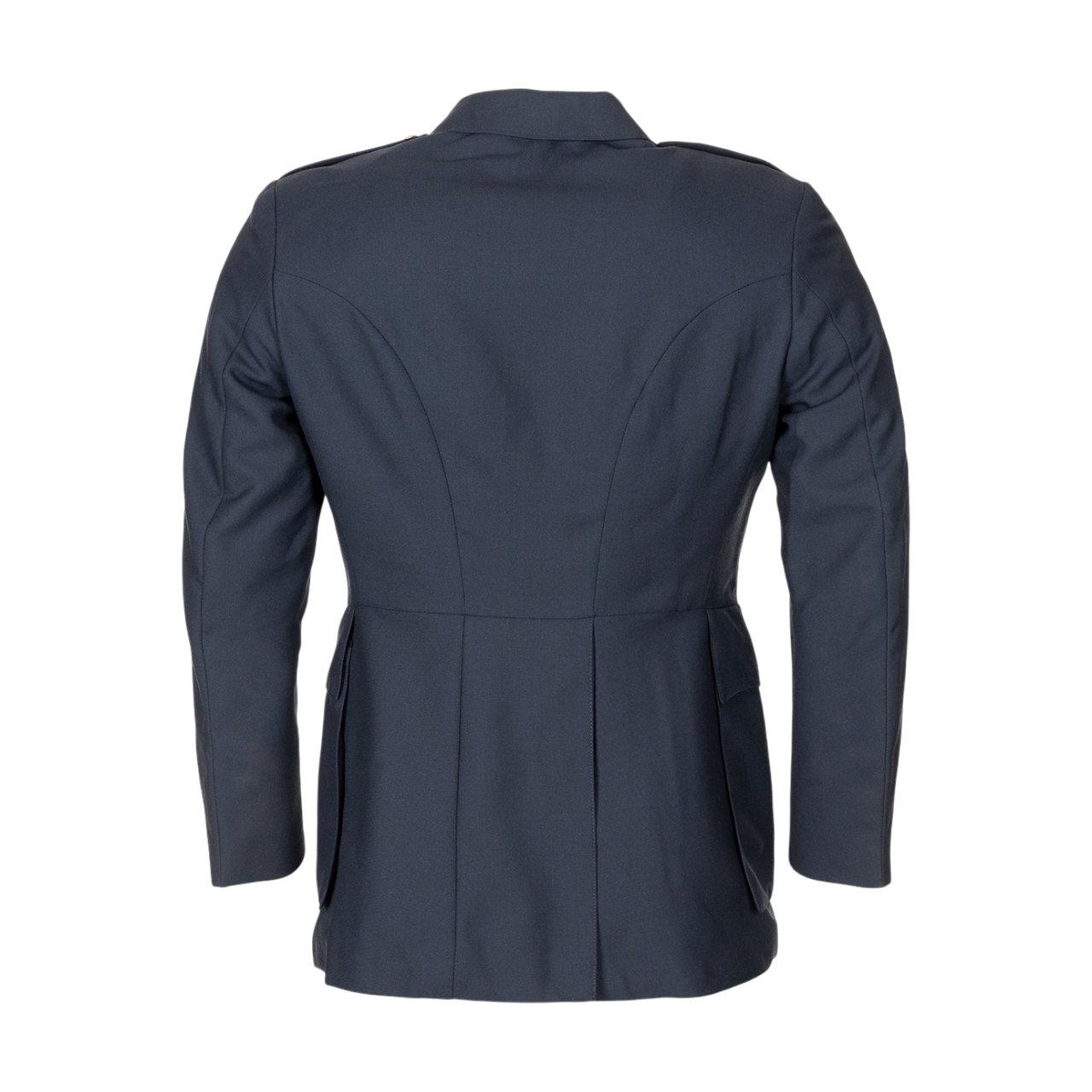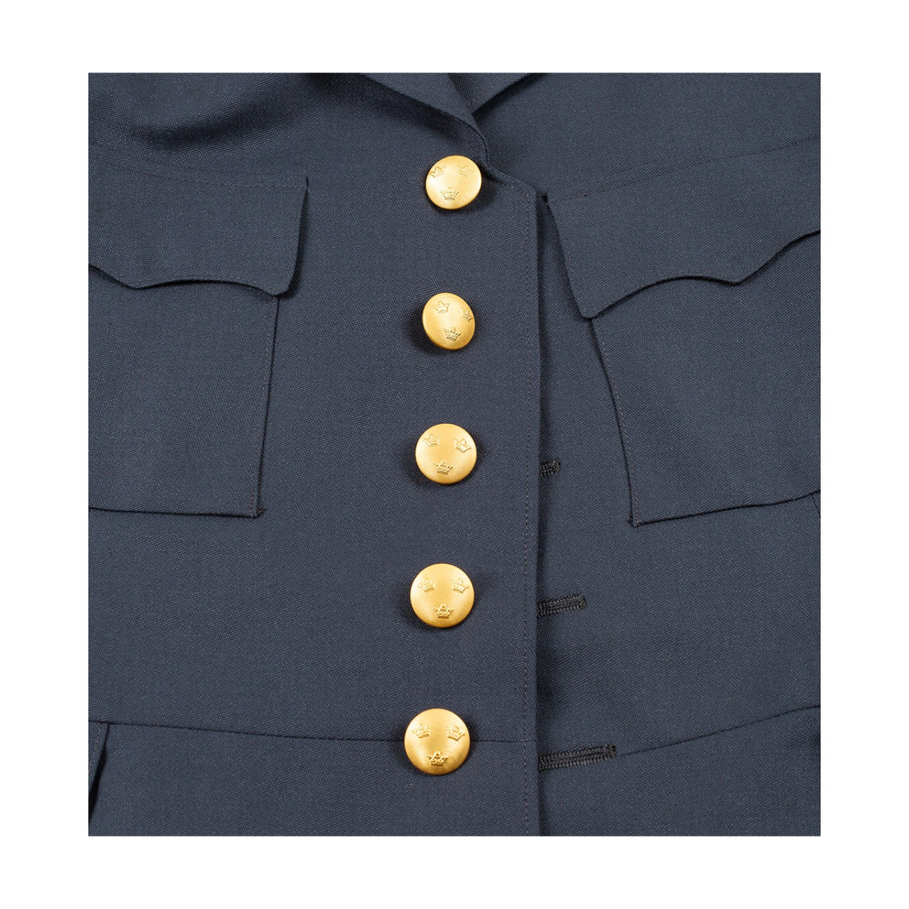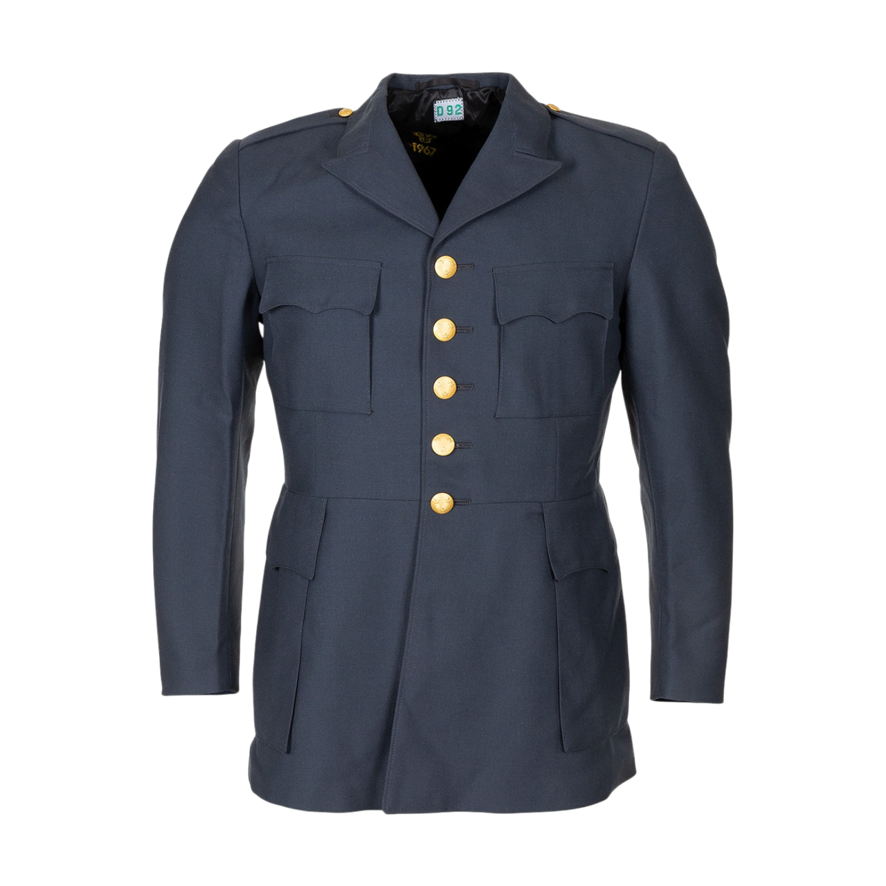 Made in an elegant shade of dark blue and accessorized with gold buttons, the jacket offers a distinguished look, ideal for both collectors and enthusiasts of vintage military clothing or classic-inspired outfits.