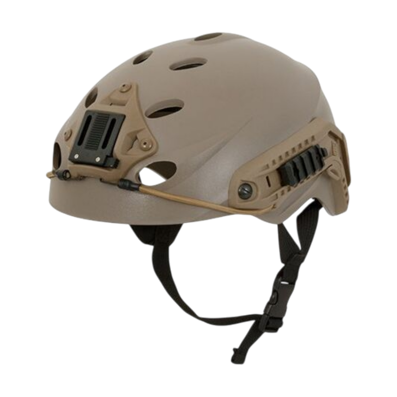 The fastening system consists of a plastic buckle and adjustable chin straps, providing stability and a secure fit during movement. The side rails allow for the attachment of various tactical accessories, enhancing the helmet's functionality.