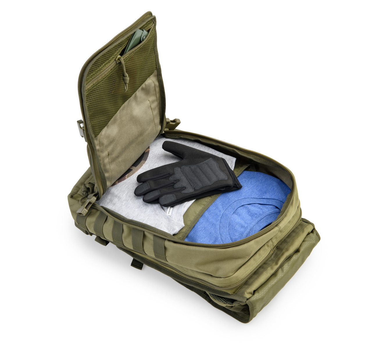 The outside pocket has top MOLLE webbings and attachment points, a carry emergency handle and 3 ports for accessories.